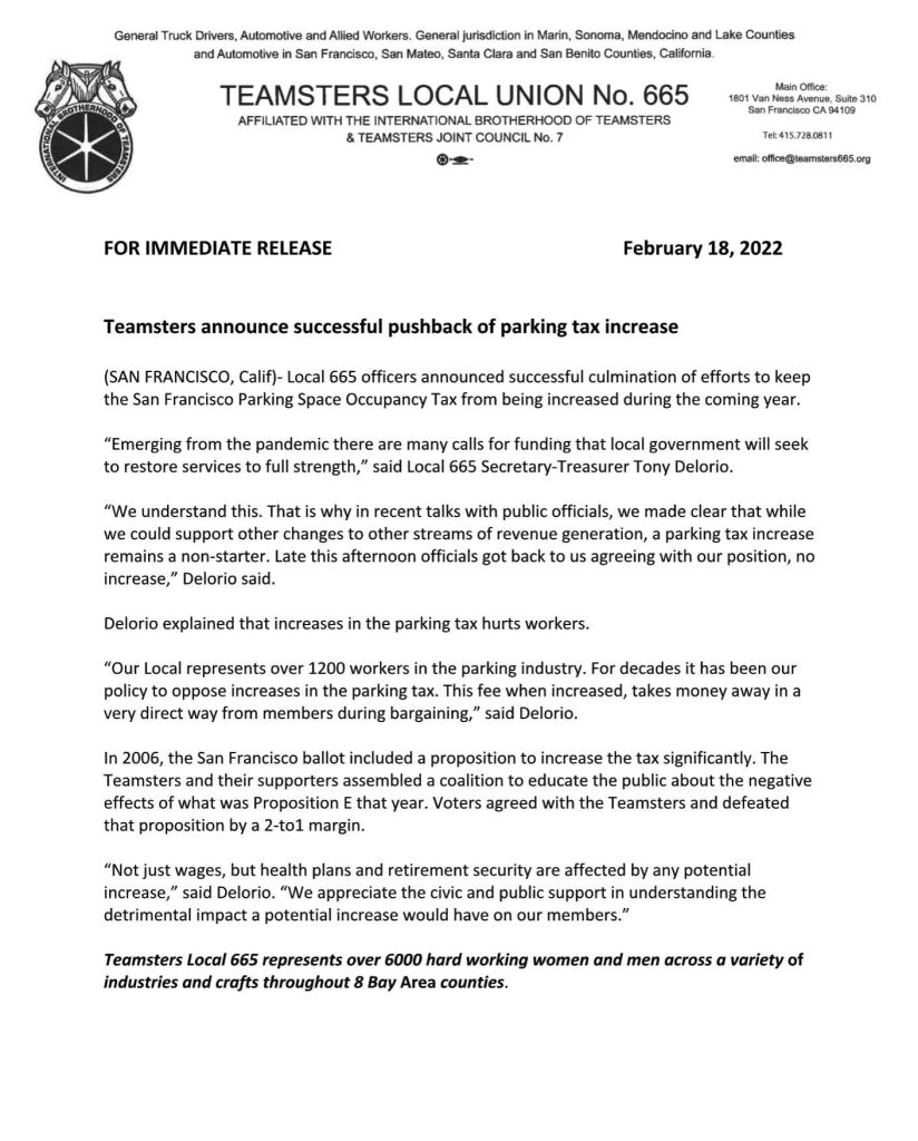 So for many months now, Tony Delorio, Principal Officer of Teamsters Local 665, has been in negotiations with the City of San Francisco to defeat the parking tax increase.