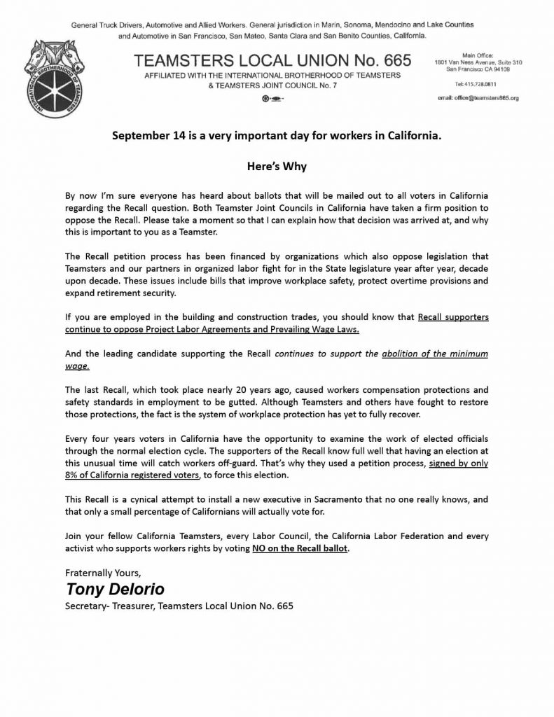 By now I’m sure everyone has heard about ballots that will be mailed out to all voters in California regarding the Recall question. Both Teamster Joint Councils in California have taken a firm position to oppose the Recall. Please take a moment so that I can explain how that decision was arrived at, and why this is important to you as a Teamster.